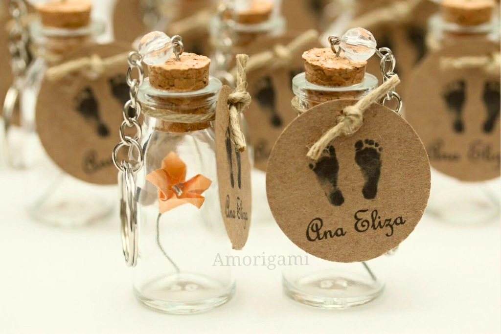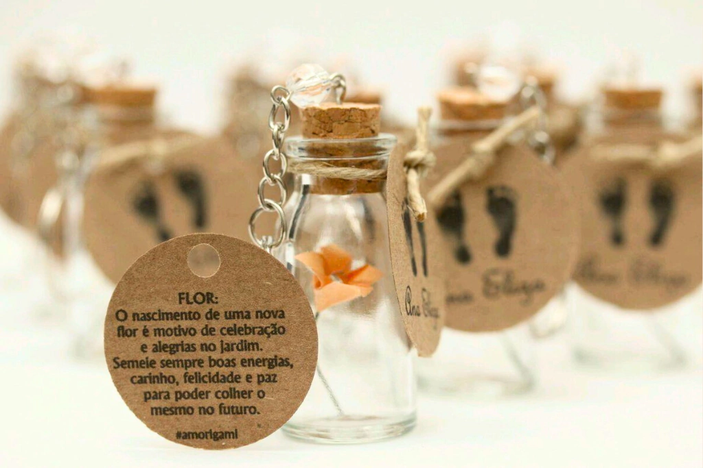 Cada chaveiro traz uma delicada flor de origami, simbolizando o florescer de novas alegrias e boas energias que chegam com a chegada de uma nova vida.