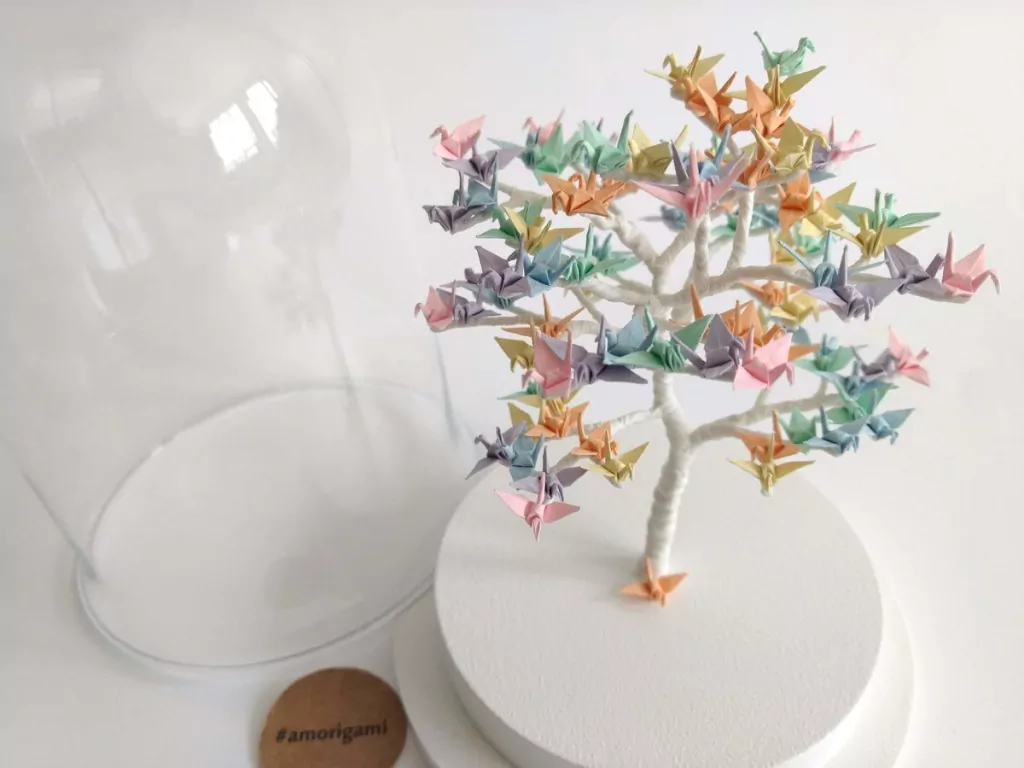 O bonsai de tsurus é feito com galhos artificiais e 100 mini tsurus dobrados, tudo feito manualmente. É fixada na base redonda de MDF e fechado com uma redoma de vidro.