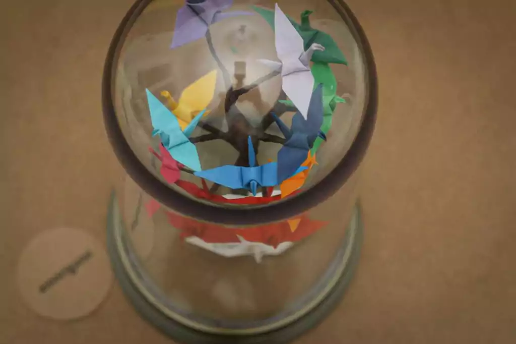 O tsuru da base da redoma pode ser personalizado com uma palavra, frase ou ideograma.