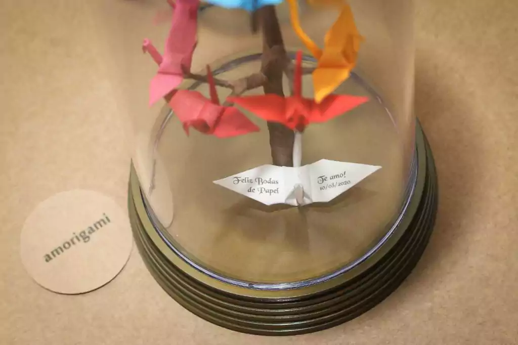 Árvore com galhos contendo 12 tsurus, representando os 12 primeiros meses de união. Na base, um tsuru personalizado escrito Bodas de Papel numa asa e o nome do casal e a data na outra asa