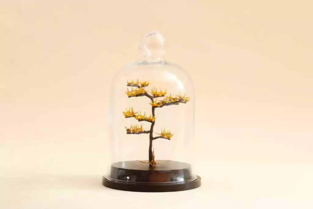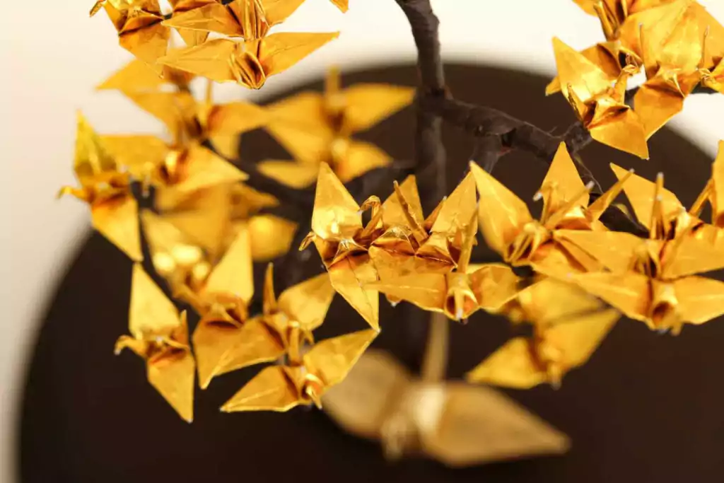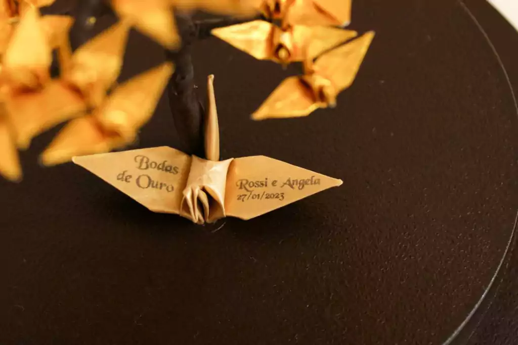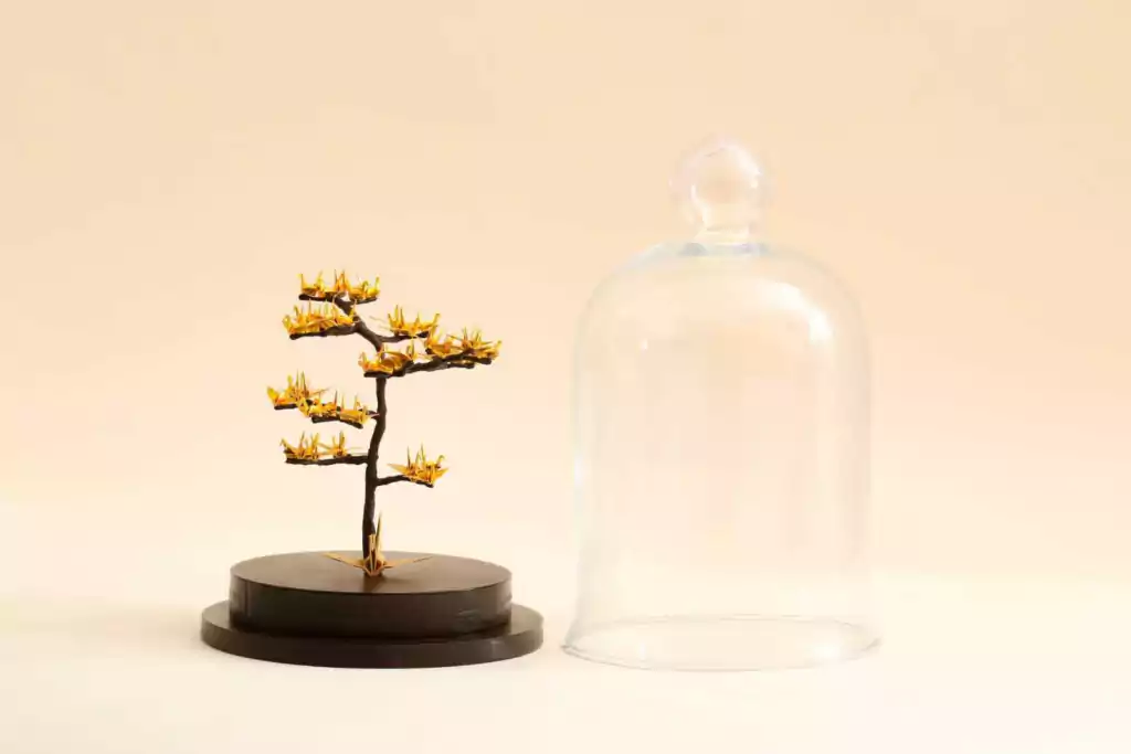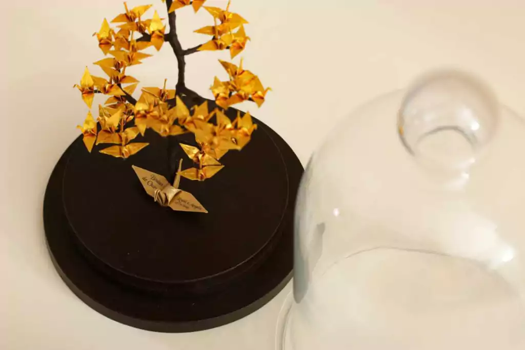 O bonsai de tsurus é feito com galhos artificiais e 50 mini tsurus dobrados, tudo feito manualmente representando os anos de união. É fixada na base redonda de MDF e fechado com uma redoma de vidro.