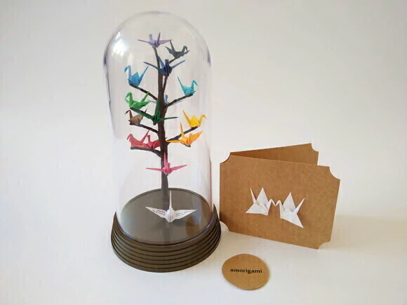 Árvore feita com galhos artificiais e tsurus de origami. Na base, um pássaro que pode ter as asas personalizadas.