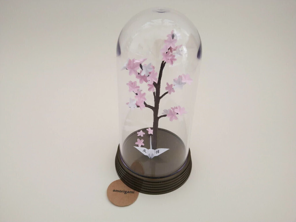 Galho com sakuras - flores de cerejeira e um tsuru personalizado, dentro de uma redoma. É fixada na base redonda de plástico e fechado com uma redoma de acrílico.